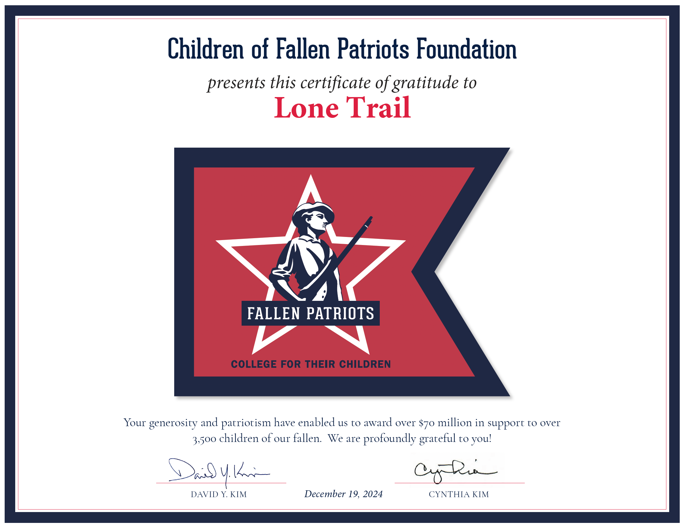 Lone Trail has a simple mission: create kick-ass gear to support veterans. 5% of all profits are donated to veterans every year. The more we sell, the more we give. We don't charge outrageous prices, and all our gear comes with a liftime guarantee.