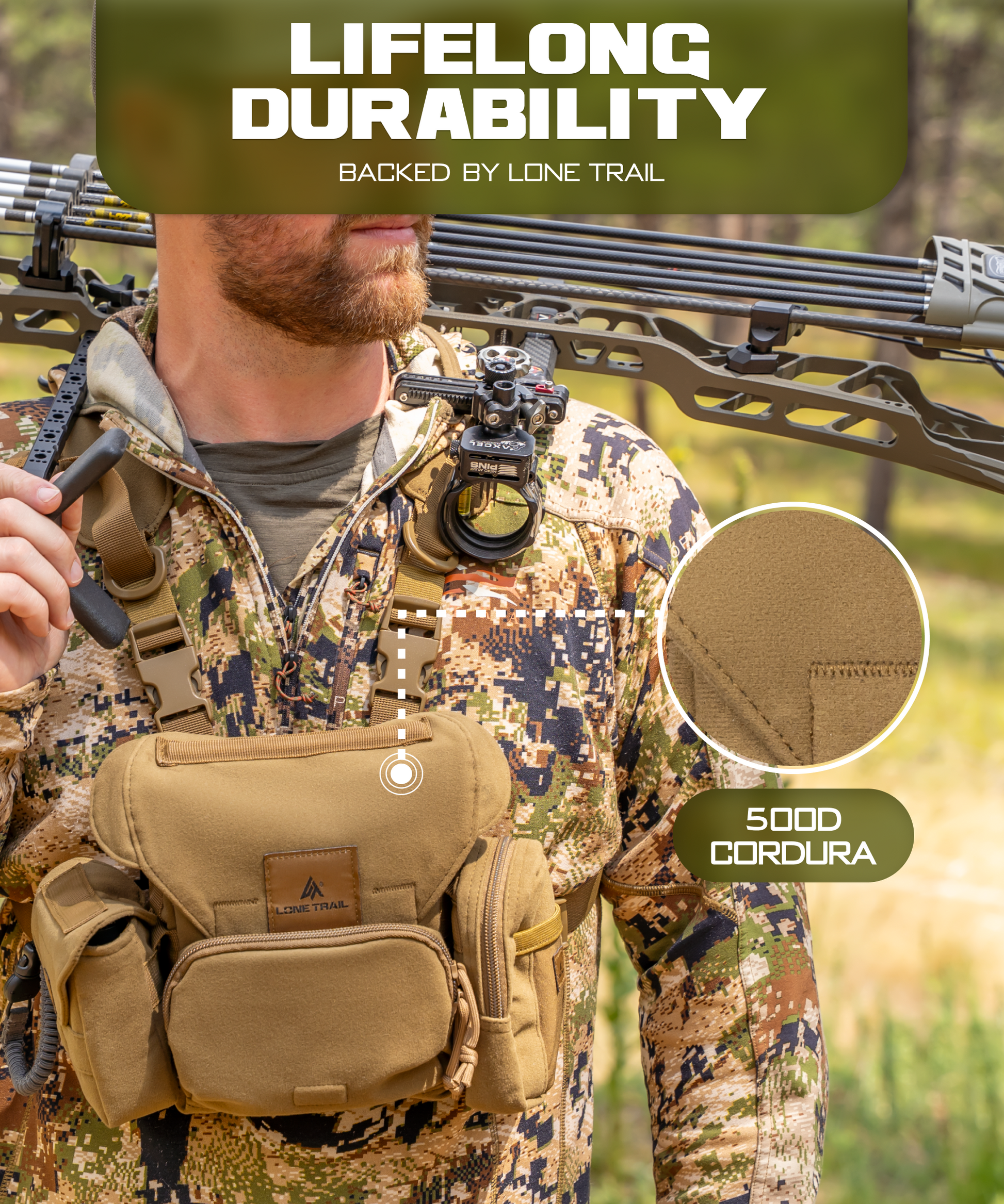 The LT1 Bino Harness is constructed from military-grade 500D nylon fabric - the same durable material used in tactical military gear. This rain-resistant fabric is built to withstand thick brush, thorns, and harsh weather conditions. Customers with military experience have compared it favorably to army-issue equipment. The harness features reinforced stitching at all stress points and heavy-duty hardware for long-lasting performance.